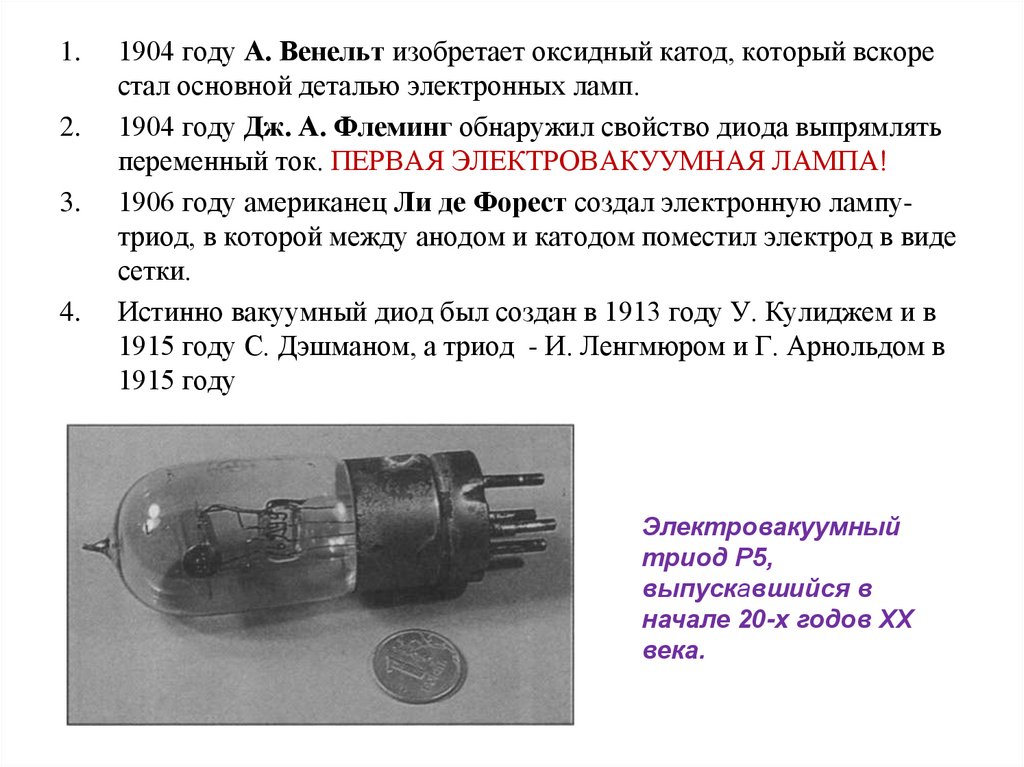 1915 году С. Дэшманом, а триод - И. Ленгмюром и Г. Арнольдом в