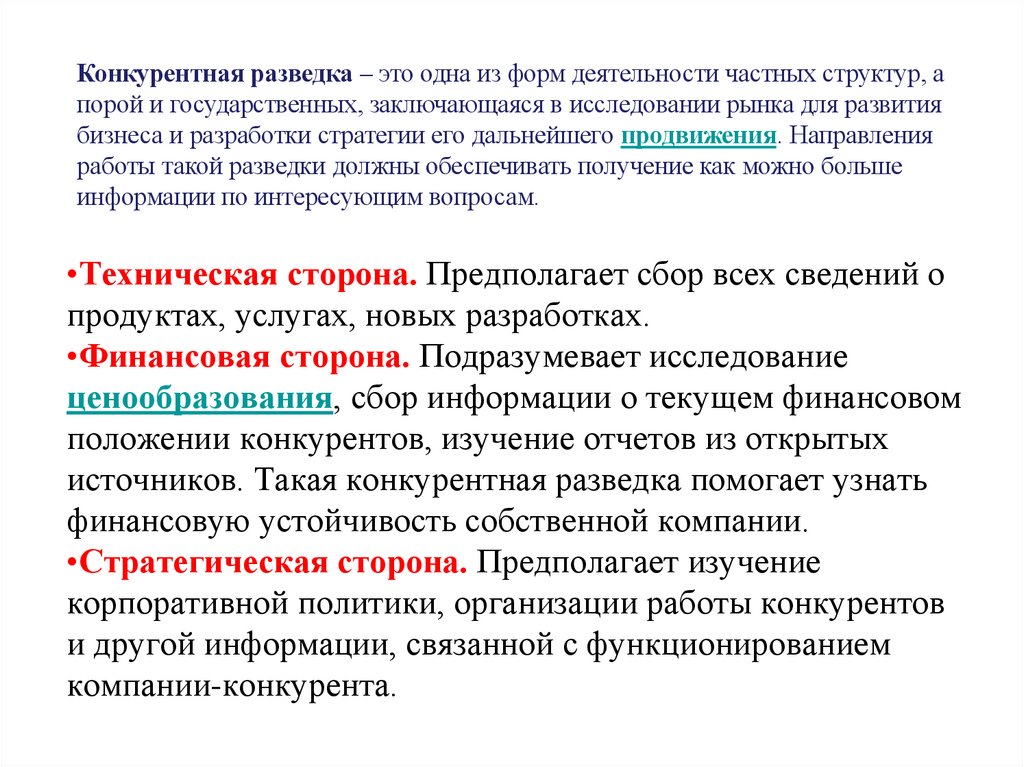 Конкурентная разведка – это одна из форм деятельности частных структур, апорой и государственных, заключающаяся в исследовании рынка для развития