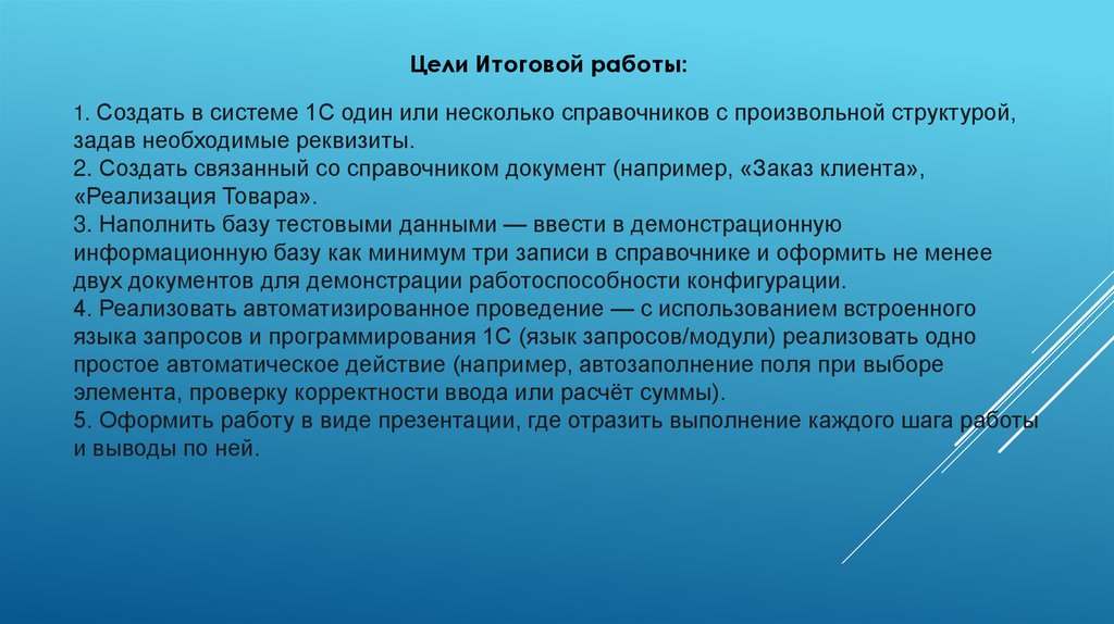 Цели Итоговой работы:1. Создать в системе 1С один или несколько справочников с произвольной структурой,
