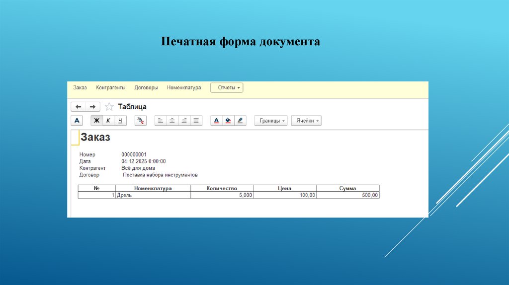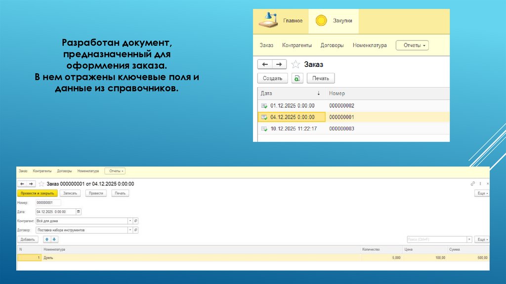 2. Создать связанный со справочником документ (например, «Заказ клиента»,