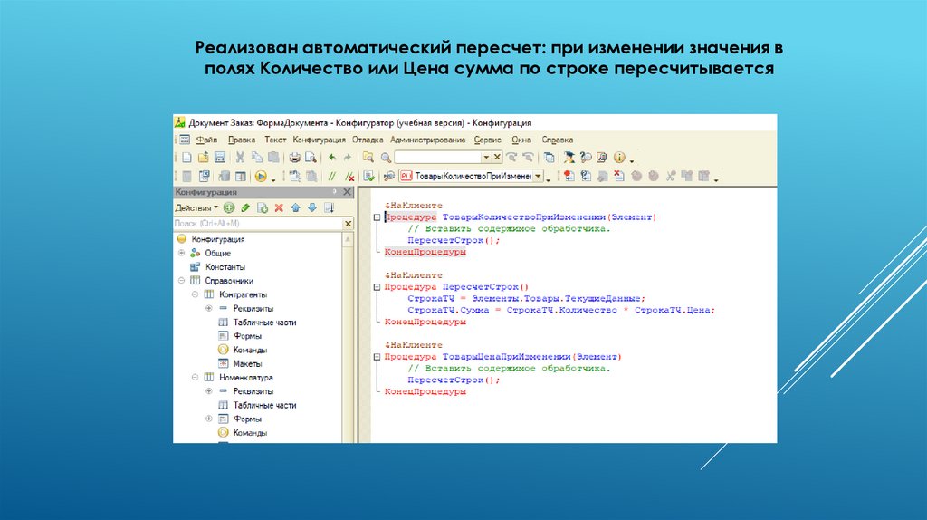 Реализован автоматический пересчет: при изменении значения вполях Количество или Цена сумма по строке пересчитывается