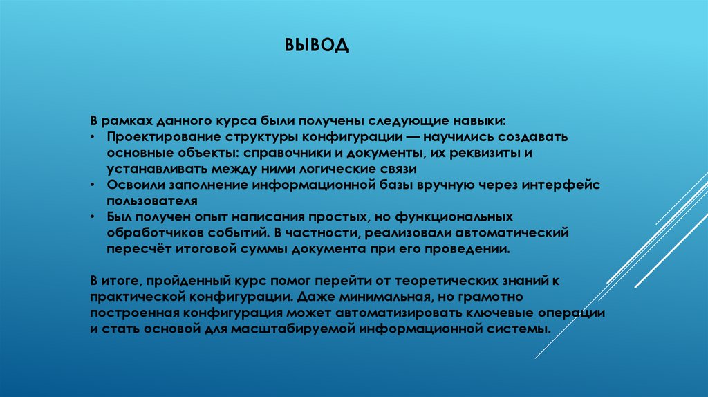 ВЫВОДВ рамках данного курса были получены следующие навыки:
