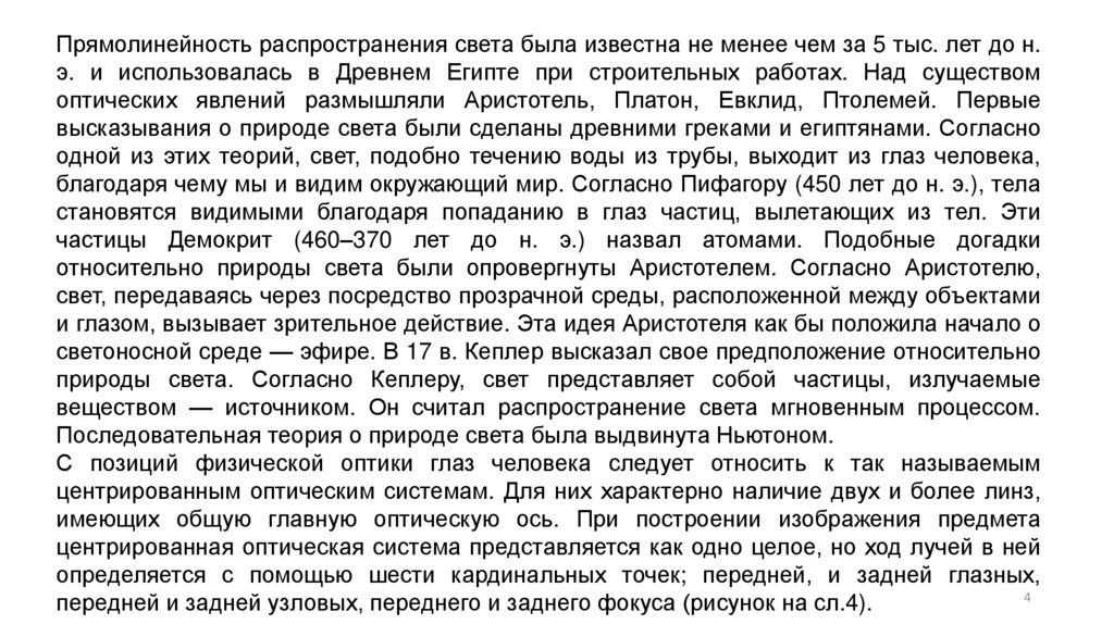 оптических явлений размышляли Аристотель, Платон, Евклид, Птолемей. Первые