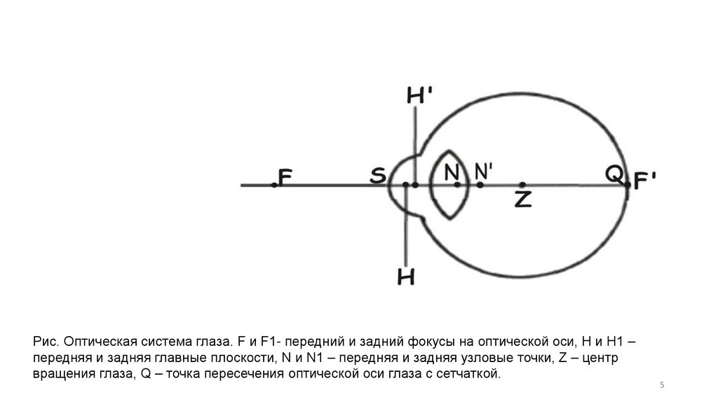 Рис. Оптическая система глаза. F и F1- передний и задний фокусы на оптической оси, H и H1 –передняя и задняя главные плоскости, N и N1 – передняя и задняя узловые точки, Z – центр