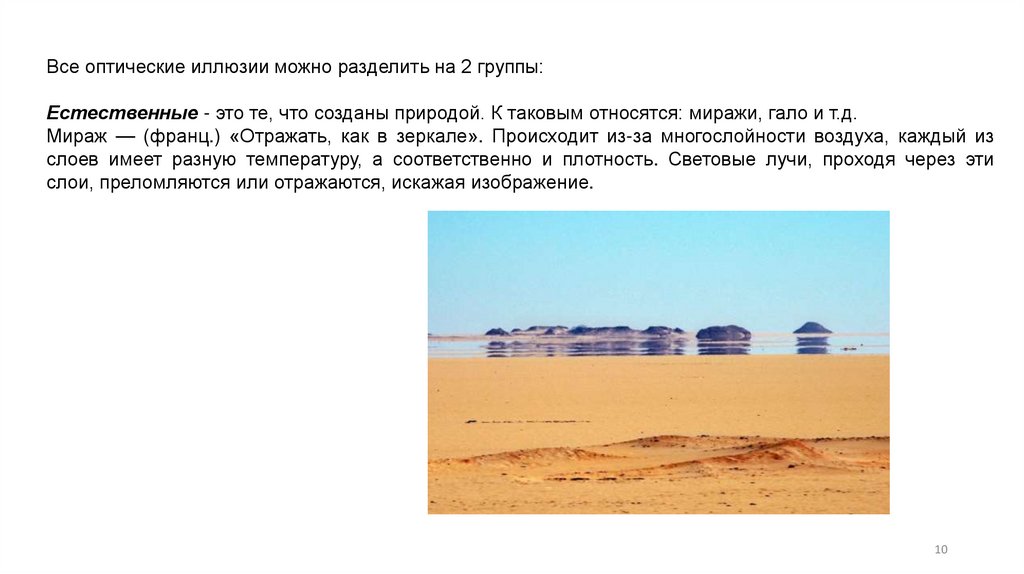 Все оптические иллюзии можно разделить на 2 группы:Естественные - это те, что созданы природой. К таковым относятся: миражи, гало и т.д.