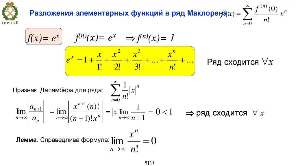 Разложения элементарных функций в ряд Маклорена:f ( x)