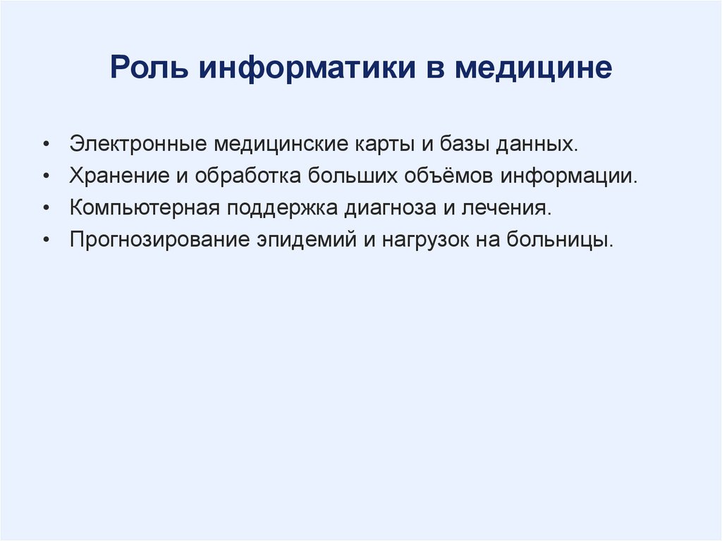 Роль информатики в медицинеЭлектронные медицинские карты и базы данных.