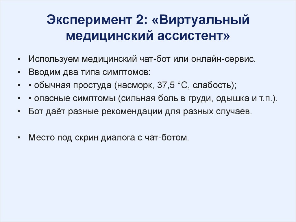 Эксперимент 2: «Виртуальныймедицинский ассистент»