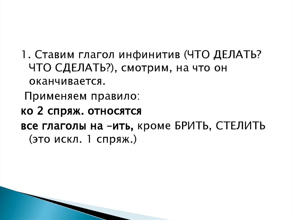 1. Ставим глагол инфинитив (ЧТО ДЕЛАТЬ?ЧТО СДЕЛАТЬ?), смотрим, на что он