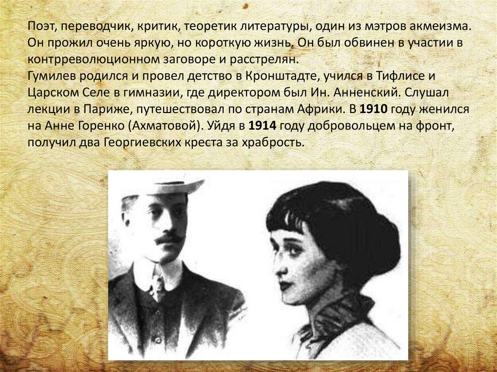 Поэт, переводчик, критик, теоретик литературы, один из мэтров акмеизма.Он прожил очень яркую, но короткую жизнь. Он был обвинен в участии в