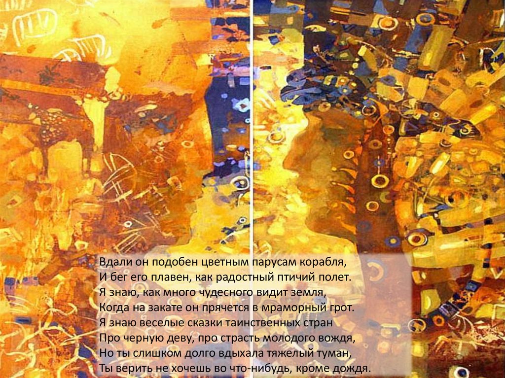 Вдали он подобен цветным парусам корабля,И бег его плавен, как радостный птичий полет.