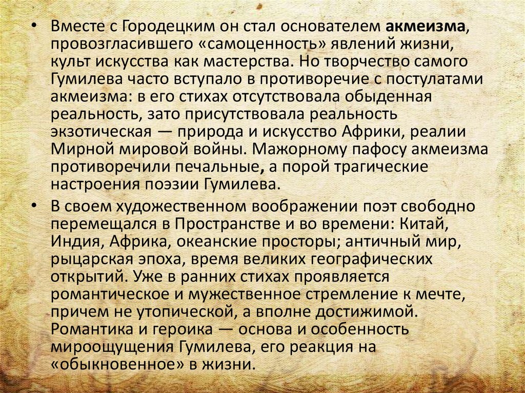 • Вместе с Городецким он стал основателем акмеизма,провозгласившего «самоценность» явлений жизни,