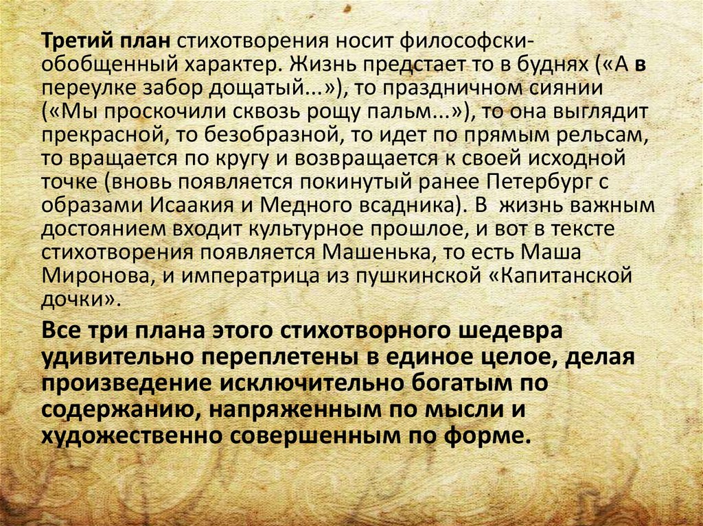 Третий план стихотворения носит философскиобобщенный характер. Жизнь предстает то в буднях («А впереулке забор дощатый...»), то праздничном сиянии