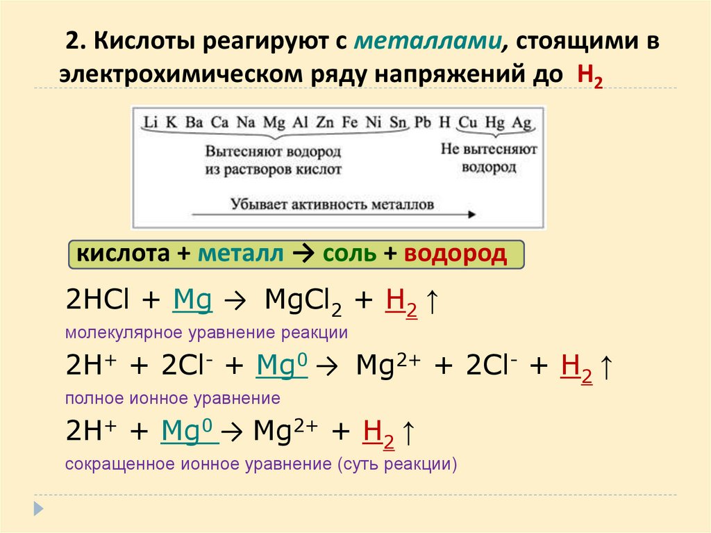 2. Кислоты реагируют с металлами, стоящими вэлектрохимическом ряду напряжений до H2