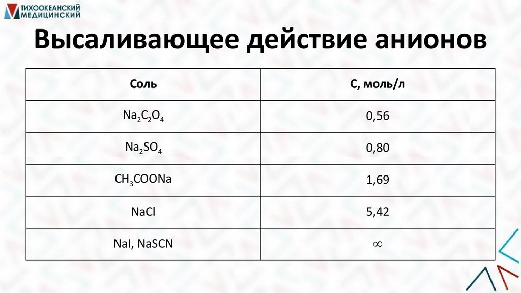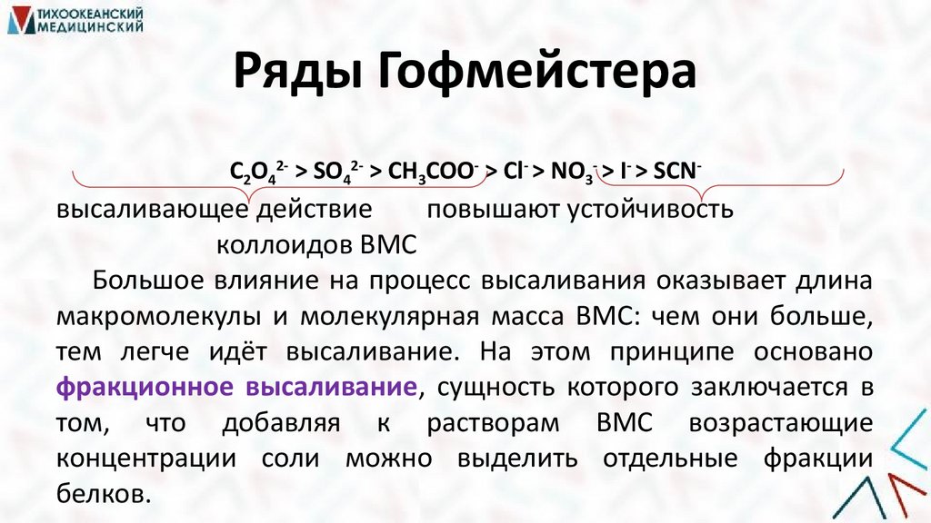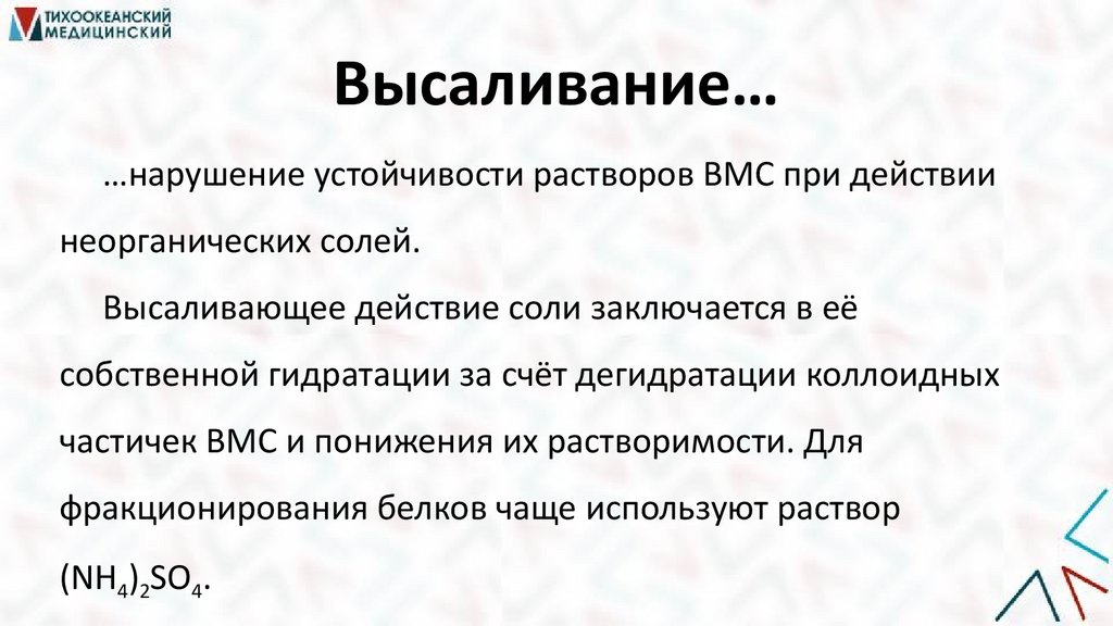 высаливание за счет дегидратации частиц ВМС и понижения их растворимости при действии солей