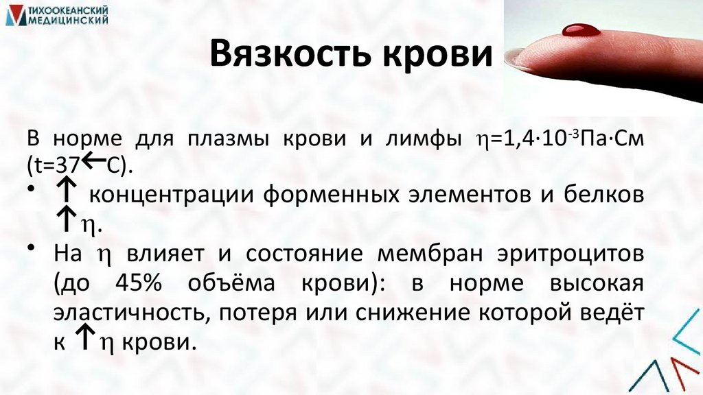 Вязкость кровиВ норме для плазмы крови и лимфы =1,4∙10 -3Па∙См