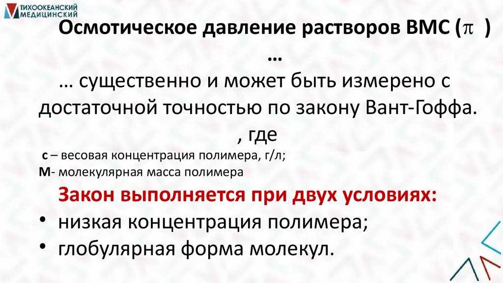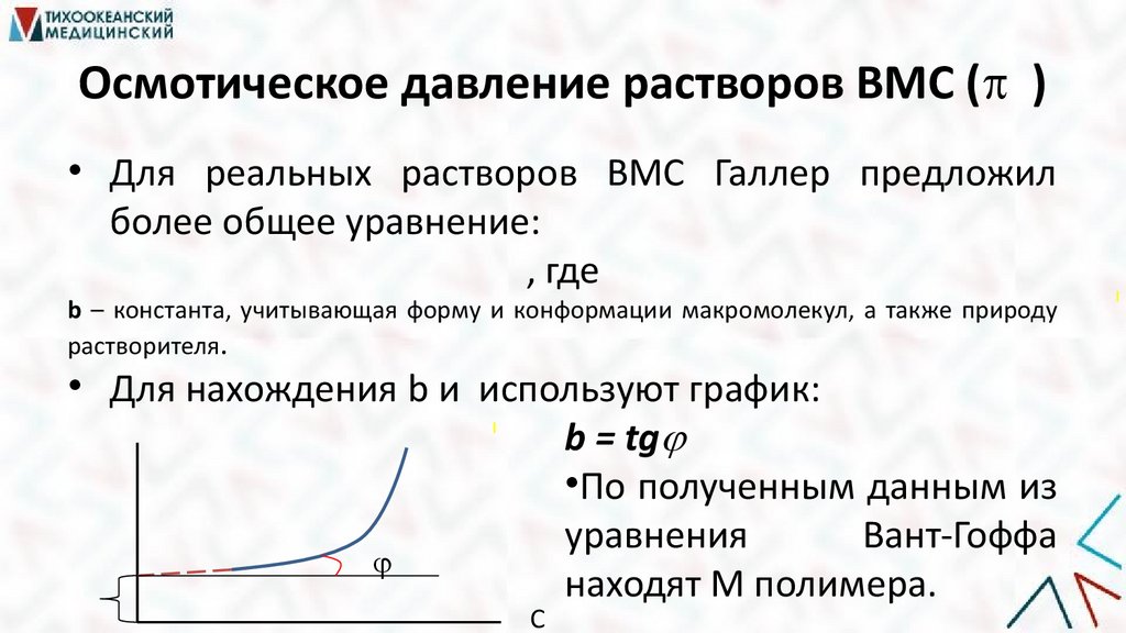 Осмотическое давление растворов ВМС ( )• Для реальных растворов ВМС Галлер предложил