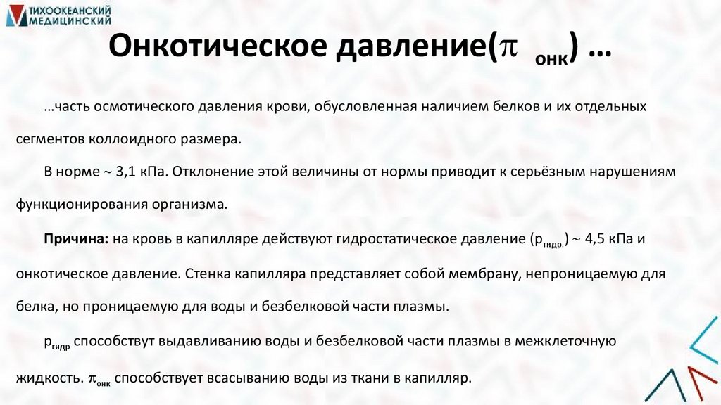 Онкотическое давление( онк) ……часть осмотического давления крови, обусловленная наличием белков и их отдельных