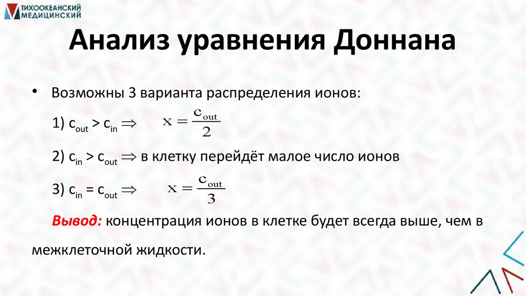Анализ уравнения Доннана• Возможны 3 варианта распределения ионов: