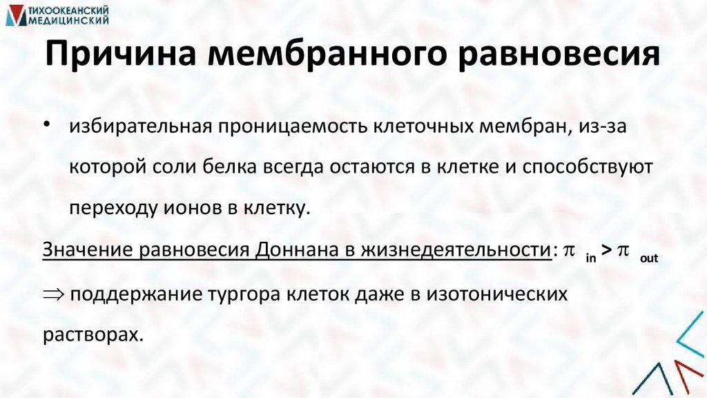 Причина мембранного равновесия• избирательная проницаемость клеточных мембран, из-за