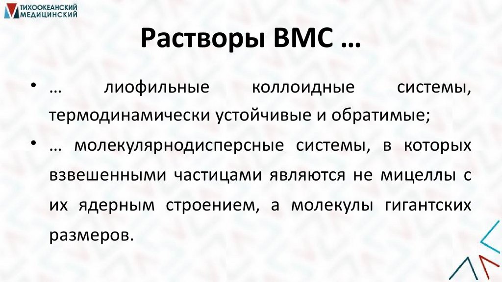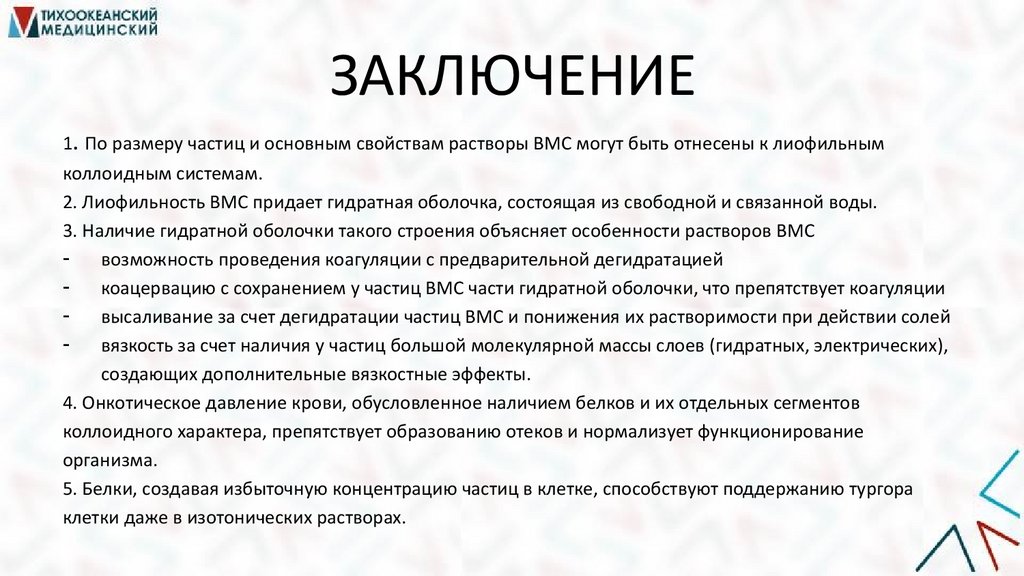 ЗАКЛЮЧЕНИЕ1. По размеру частиц и основным свойствам растворы ВМС могут быть отнесены к лиофильным
