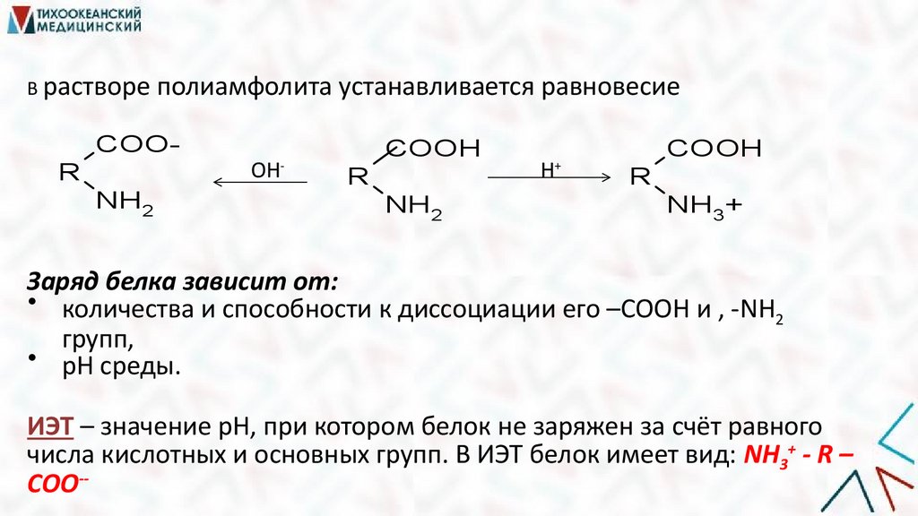 числа кислотных и основных групп. В ИЭТ белок имеет вид: NH3+ - R –
