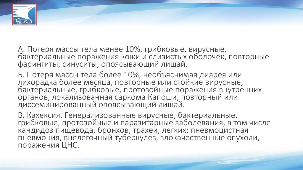 Б. Уменьшение массы тела более чем на 10%; необъяснимая диарея и лихорадка, сохраняющаяся
