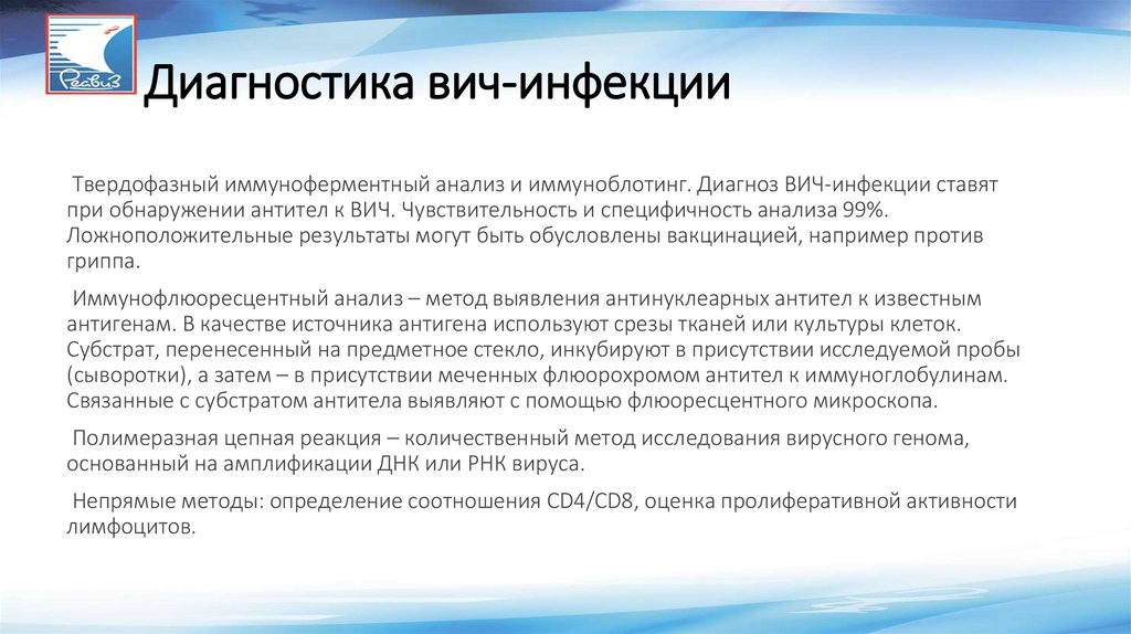 • Иммуноферментный анализ (ИФА): Выявление антител к ВИЧ в крови.