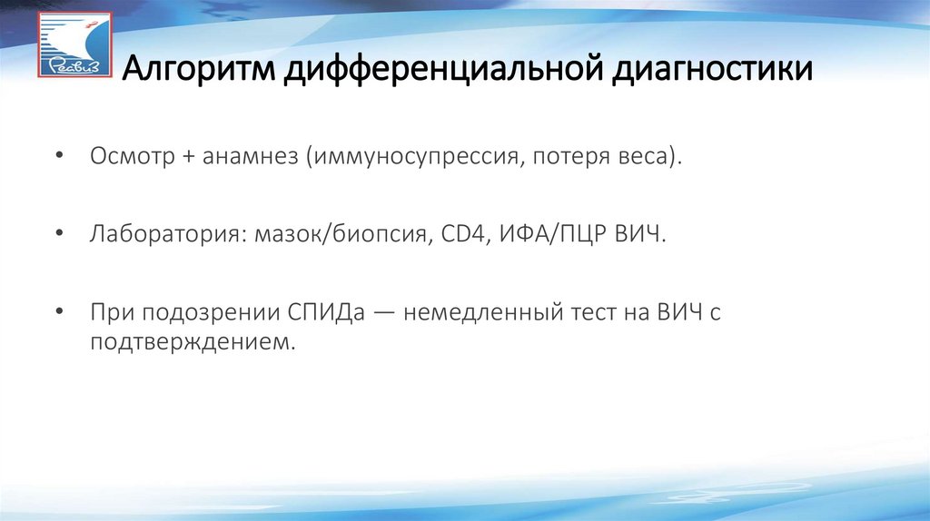 Алгоритм дифференциальной диагностики• Осмотр + анамнез (иммуносупрессия, потеря веса).