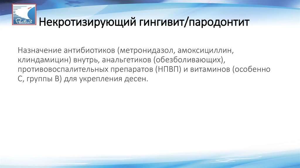 Некротизирующий гингивит/пародонтитНазначение антибиотиков (метронидазол, амоксициллин,