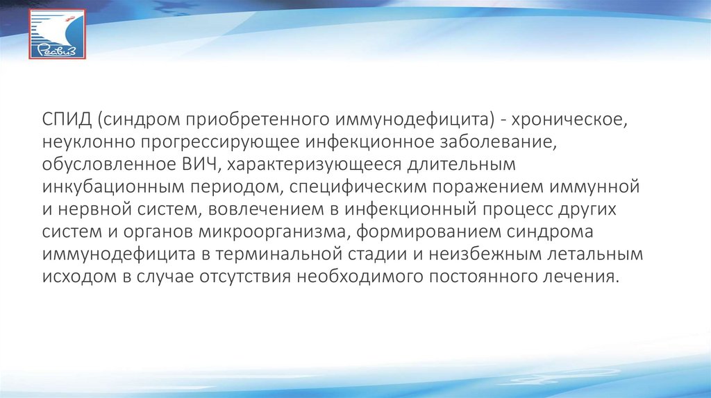 СПИД (синдром приобретенного иммунодефицита) - хроническое,неуклонно прогрессирующее инфекционное заболевание,
