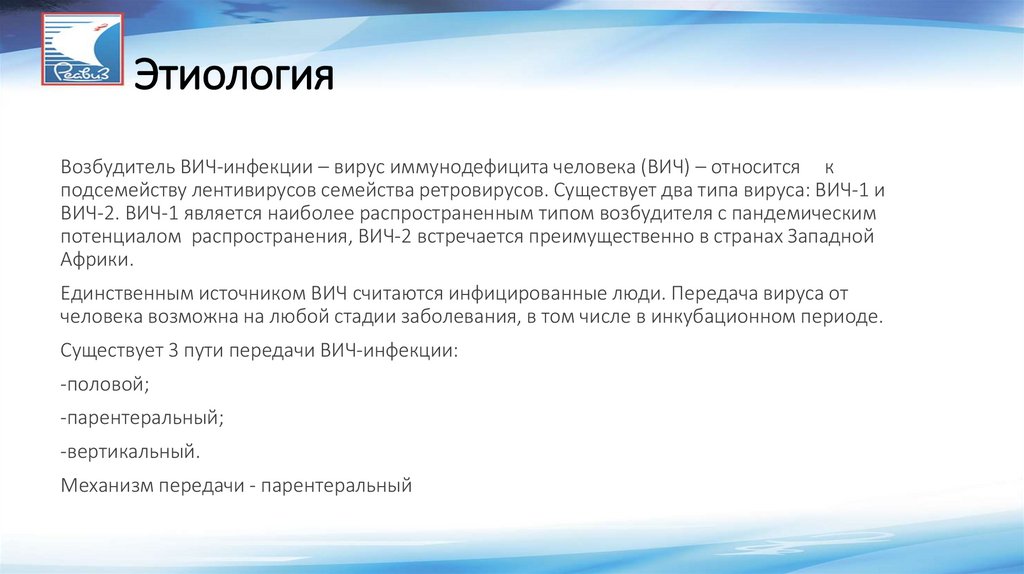 ЭтиологияВозбудитель ВИЧ-инфекции – вирус иммунодефицита человека (ВИЧ) – относится к