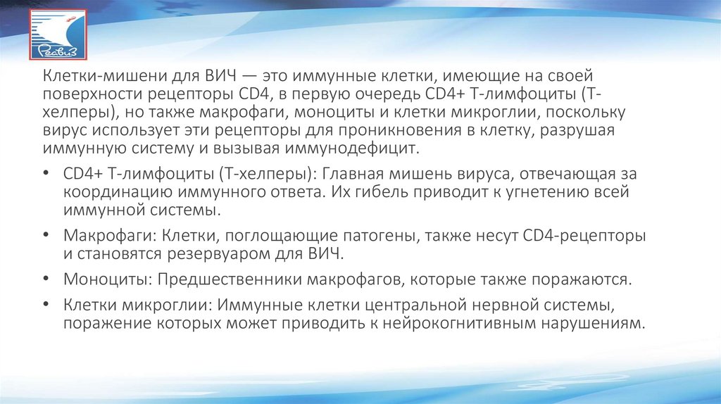 Клетки-мишени для ВИЧ — это иммунные клетки, имеющие на своейповерхности рецепторы CD4, в первую очередь CD4+ Т-лимфоциты (Тхелперы), но также макрофаги, моноциты и клетки микроглии, поскольку