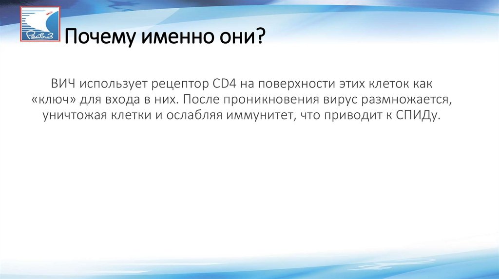 Почему именно они?ВИЧ использует рецептор CD4 на поверхности этих клеток как