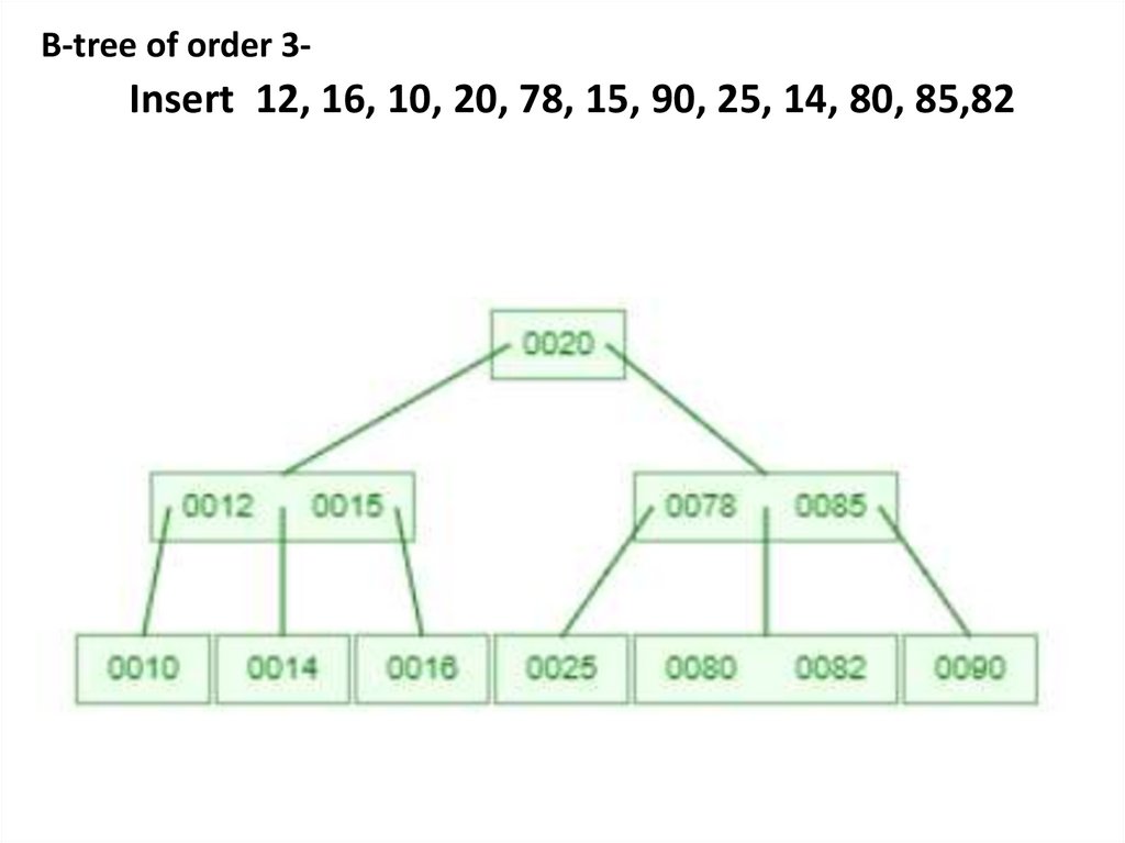 B-tree of order 3Insert 12, 16, 10, 20, 78, 15, 90, 25, 14, 80, 85,8213.