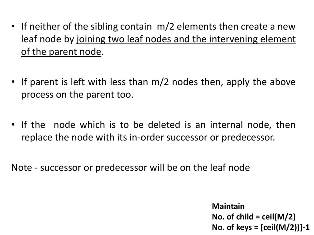 • If neither of the sibling contain m/2 elements then create a newleaf node by joining two leaf nodes and the intervening element