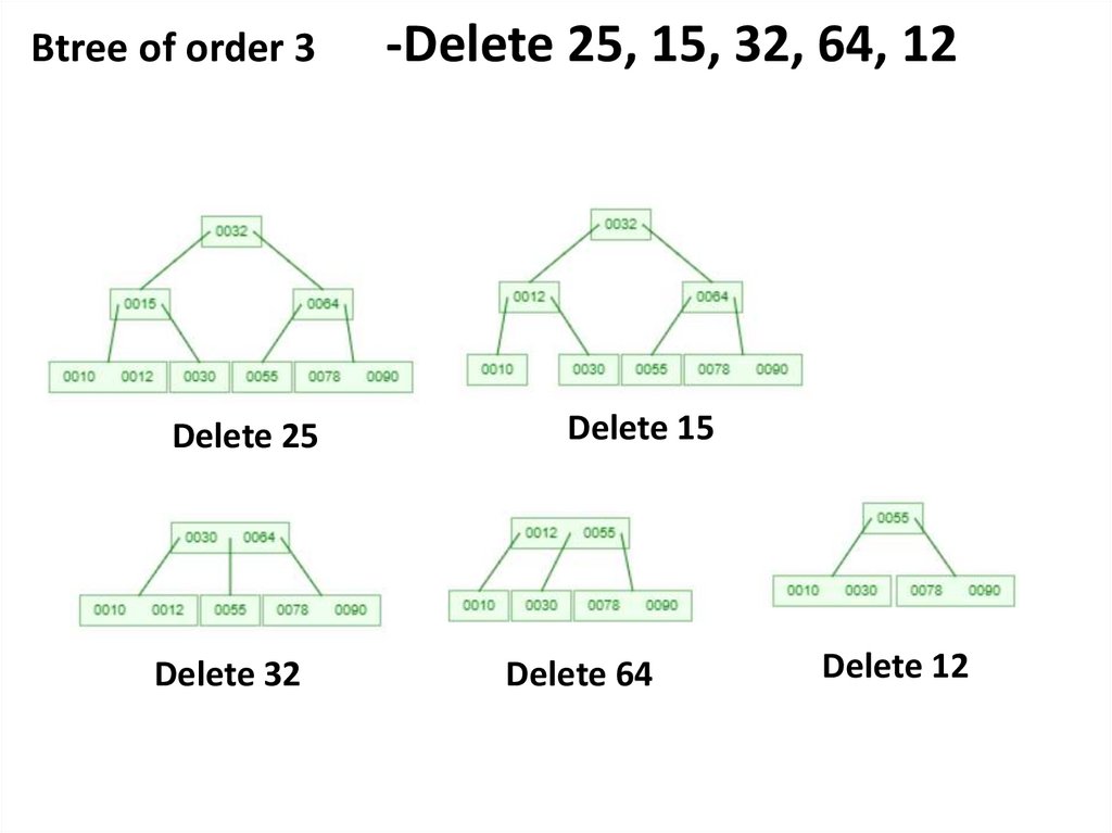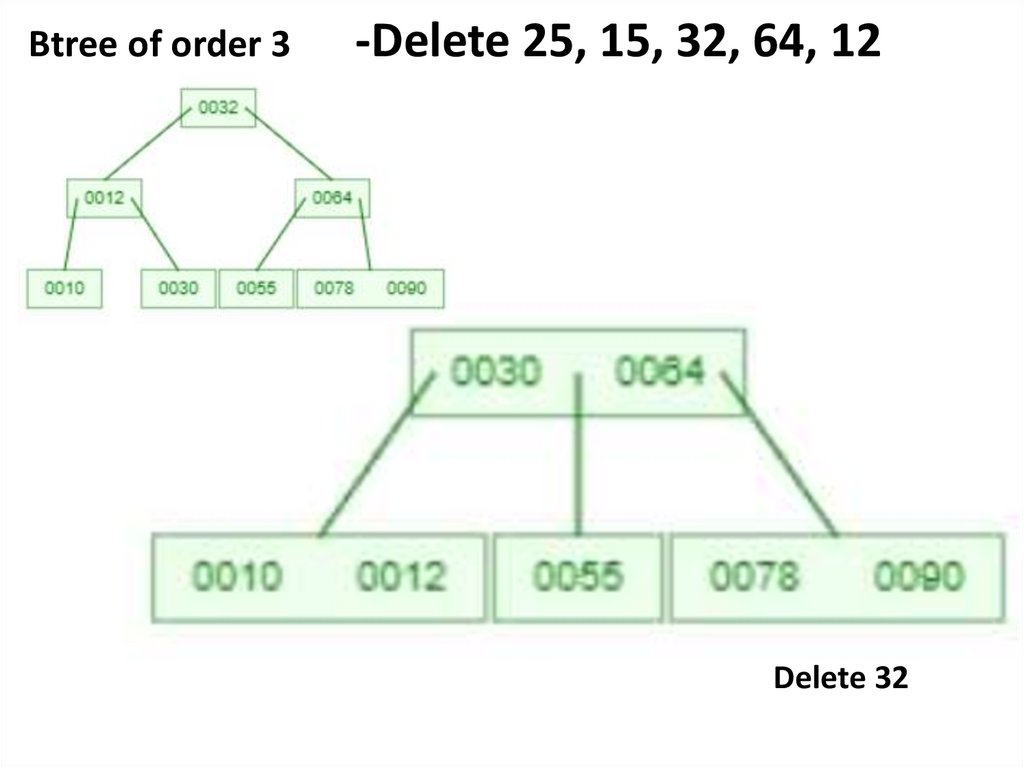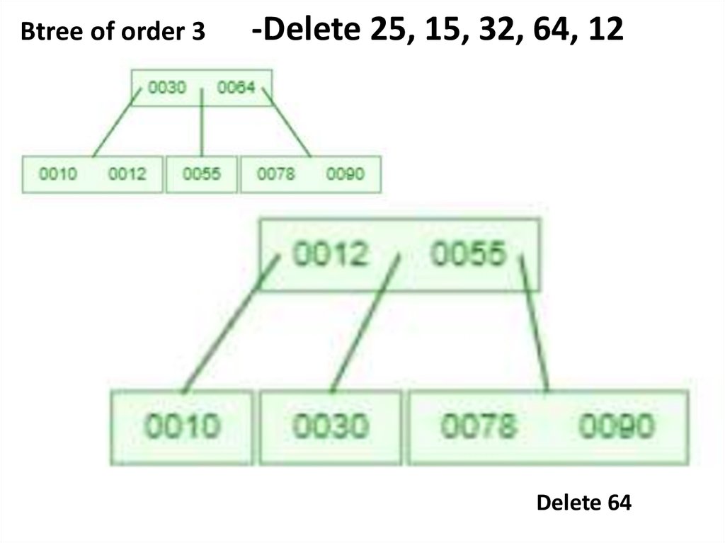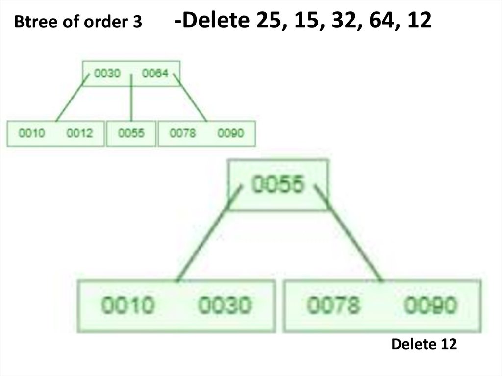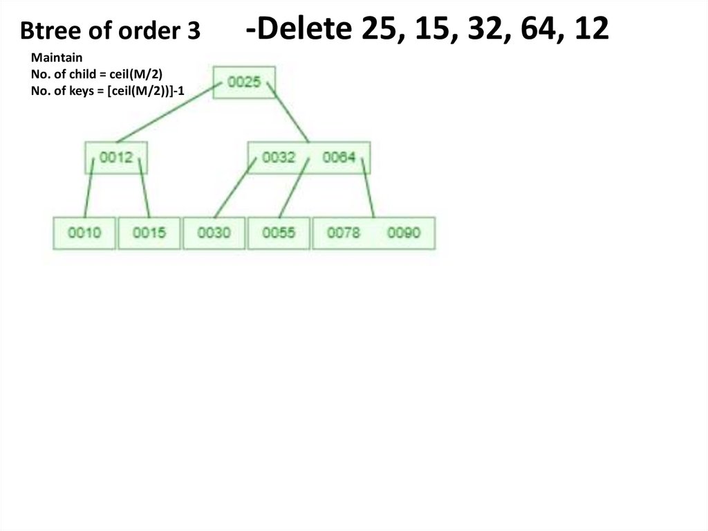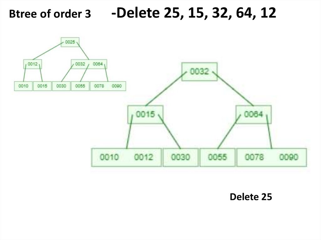 Btree of order 3-Delete 25, 15, 32, 64, 12