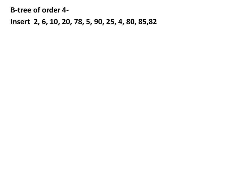 B-tree of order 4-Insert 2, 6, 10, 20, 78, 5, 90, 25, 4, 80, 85,82