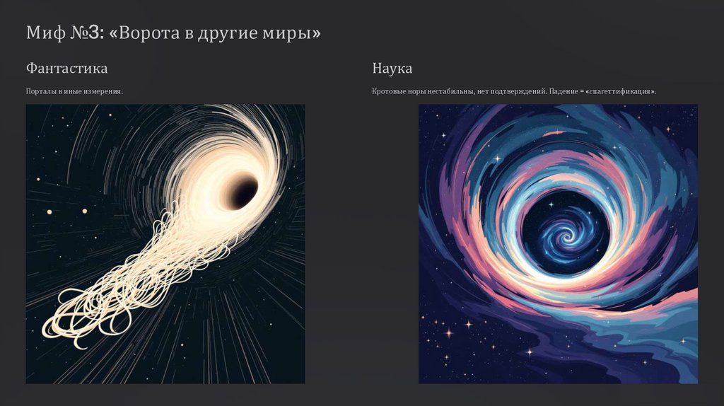 Кротовые норы нестабильны, нет подтверждений. Падение = «спагеттификация».