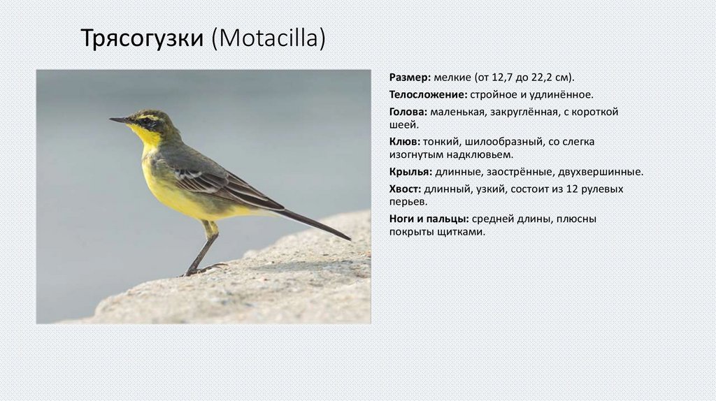 Трясогузки (Motacilla)Размер: мелкие (от 12,7 до 22,2 см).