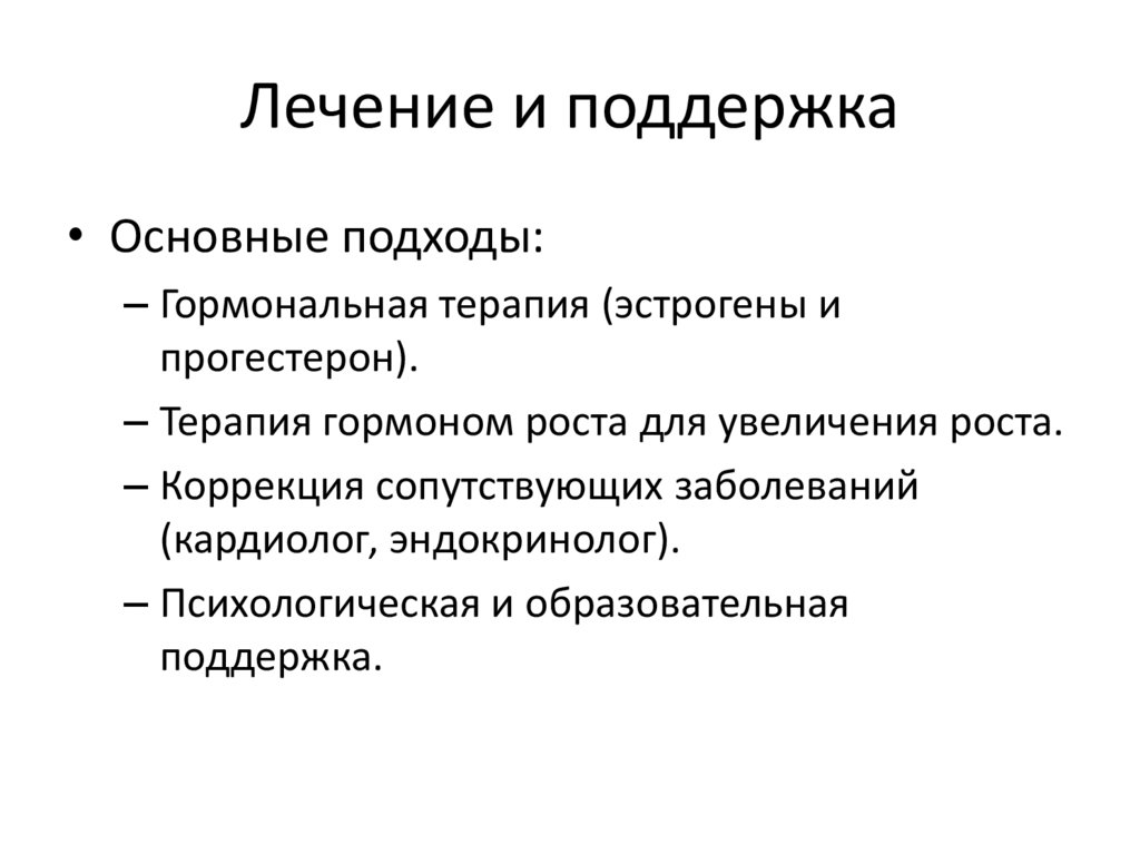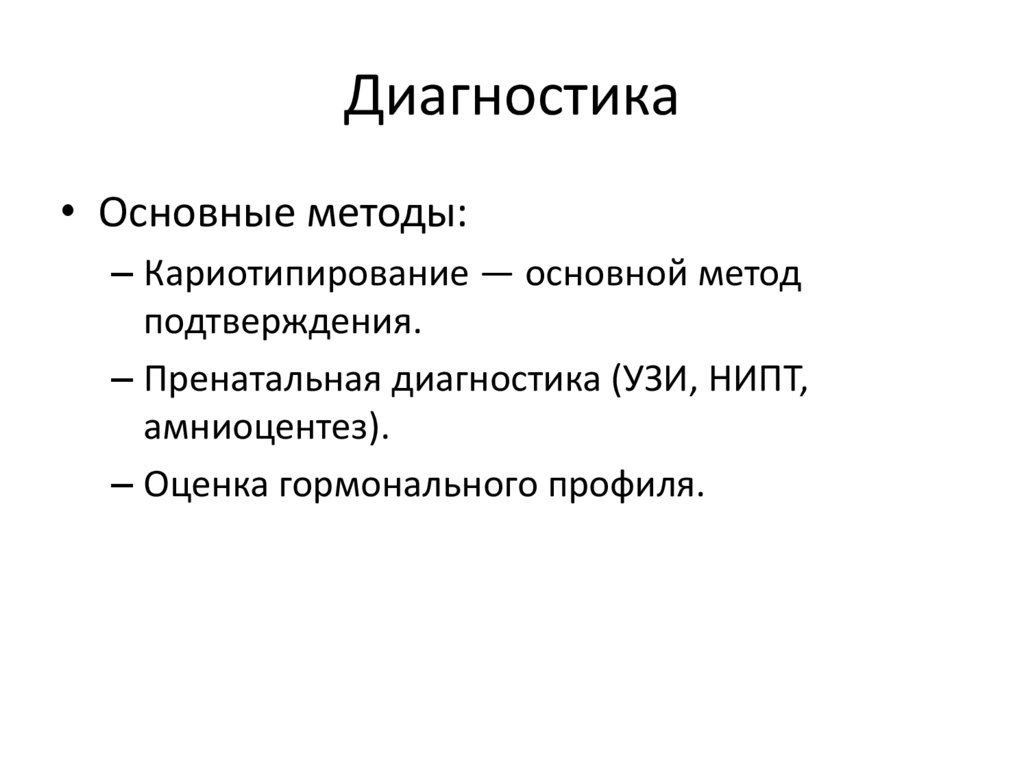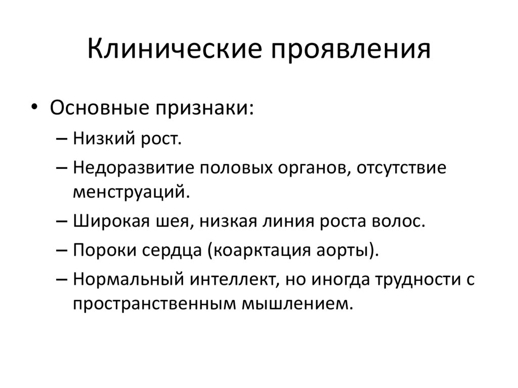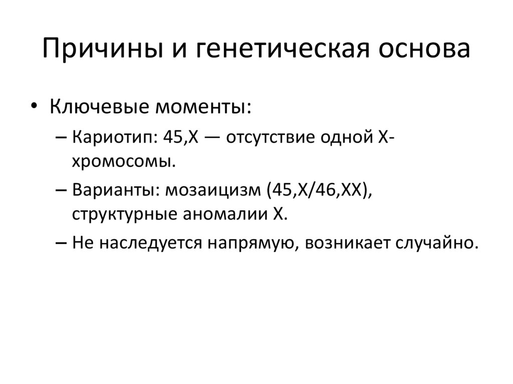 – Кариотип: 45,X — отсутствие одной Ххромосомы.