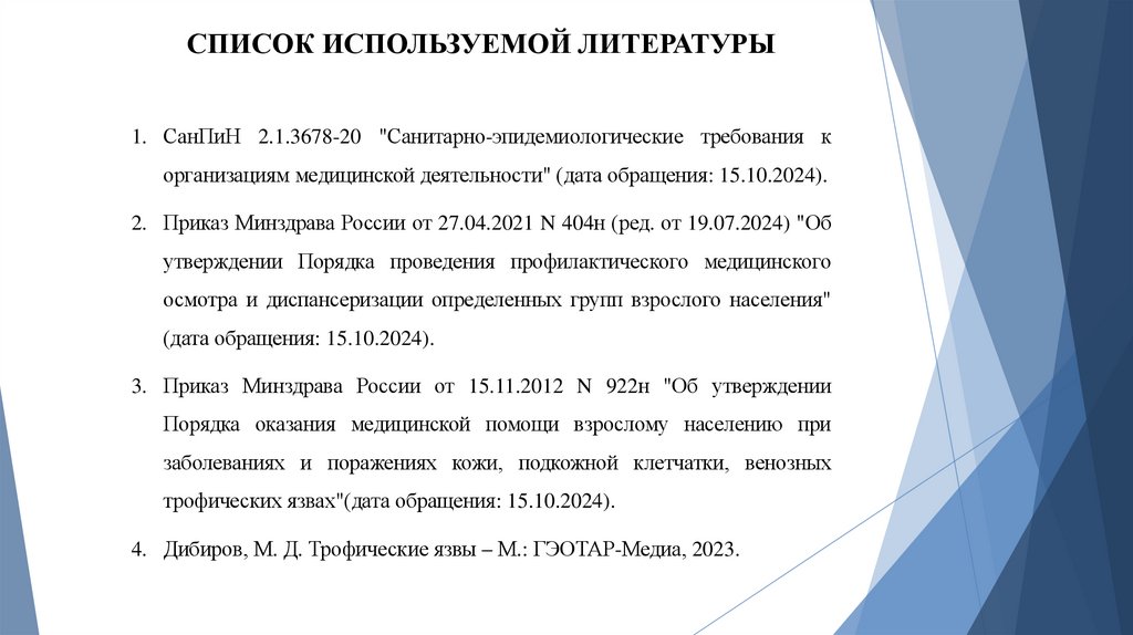 СПИСОК ИСПОЛЬЗУЕМОЙ ЛИТЕРАТУРЫ1. СанПиН 2.1.3678-20 "Санитарно-эпидемиологические требования к