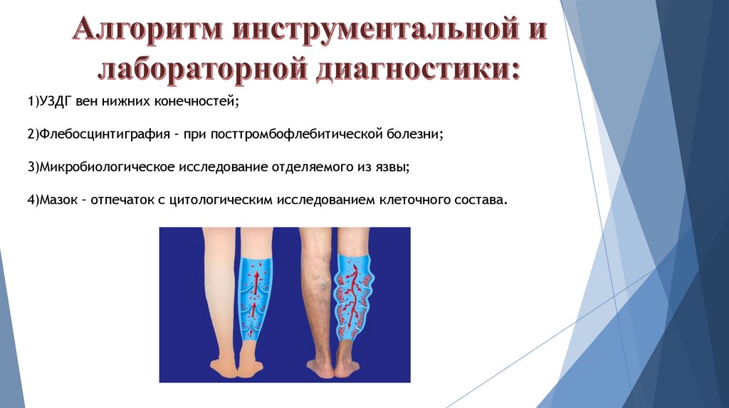 1)УЗДГ вен нижних конечностей;2)Флебосцинтиграфия – при посттромбофлебитической болезни;