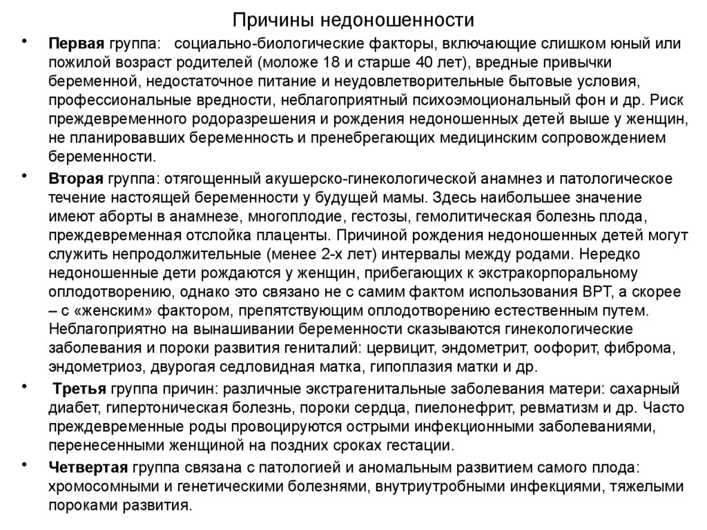 Причины недоношенностиПервая группа: социально-биологические факторы, включающие слишком юный или