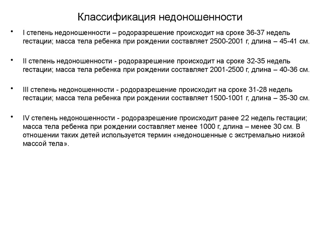 Классификация недоношенностиI степень недоношенности – родоразрешение происходит на сроке 36-37 недель