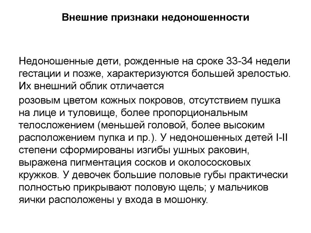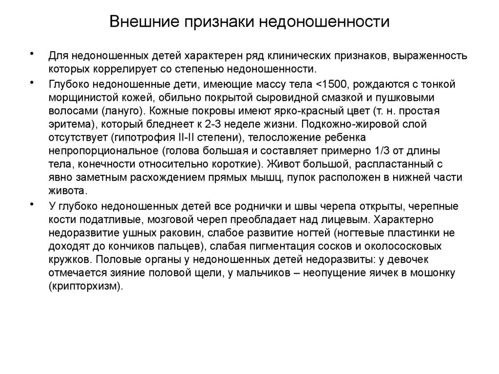 Внешние признаки недоношенностиДля недоношенных детей характерен ряд клинических признаков, выраженность
