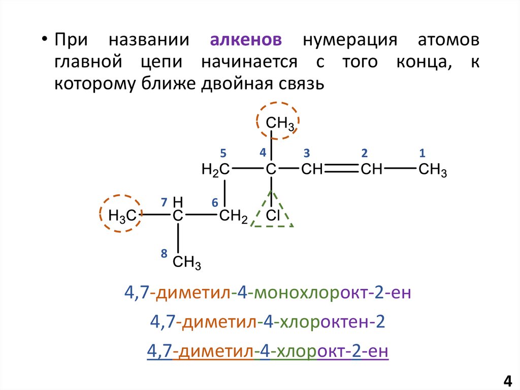 • При названии алкенов нумерация атомовглавной цепи начинается с того конца, к
