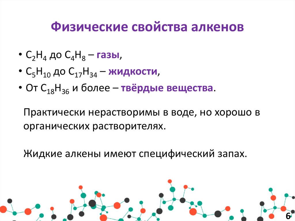 Физические свойства алкенов• C2H4 до C4H8 – газы,