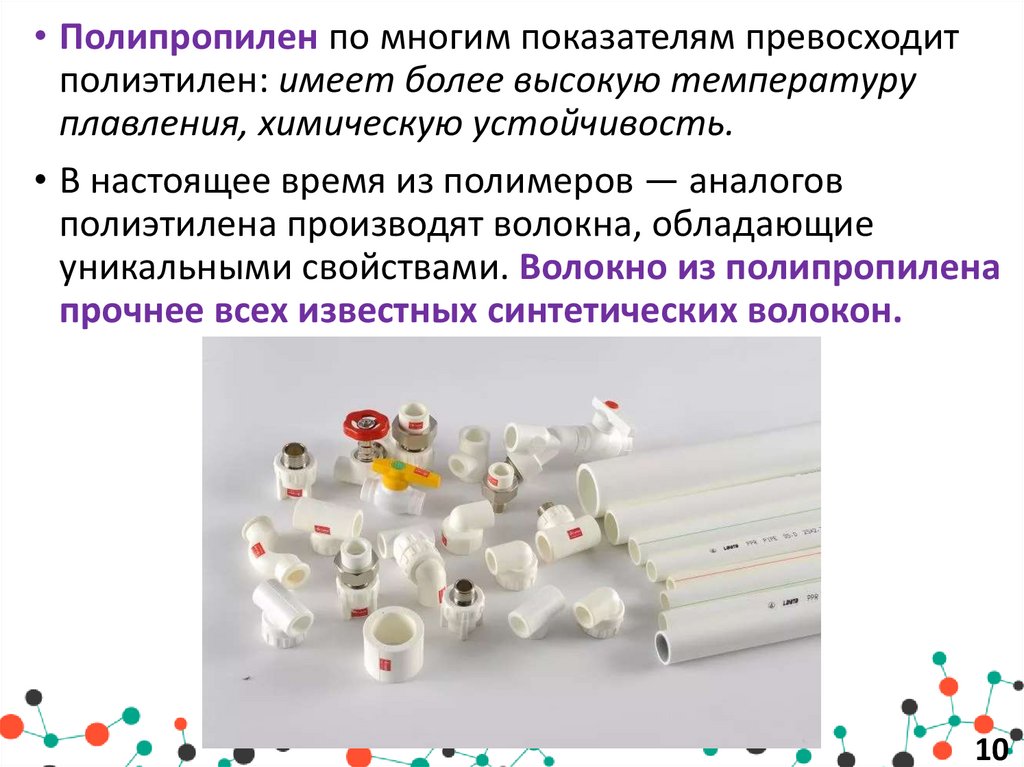 • Полипропилен по многим показателям превосходитполиэтилен: имеет более высокую температуру