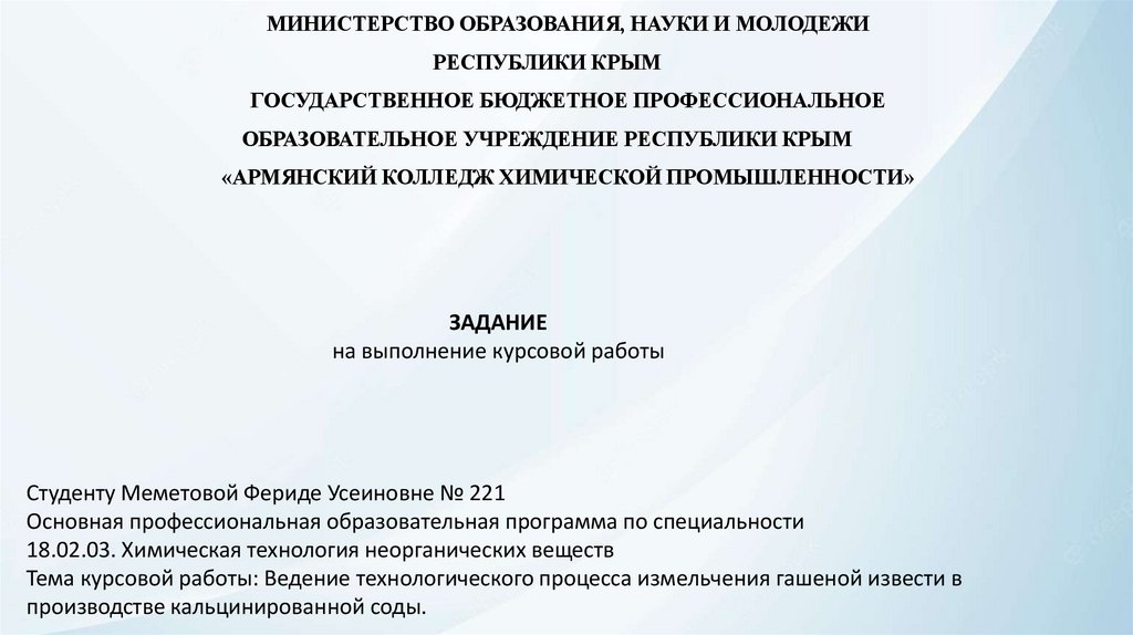 Тема курсовой работы: Ведение технологического процесса измельчения гашеной извести в